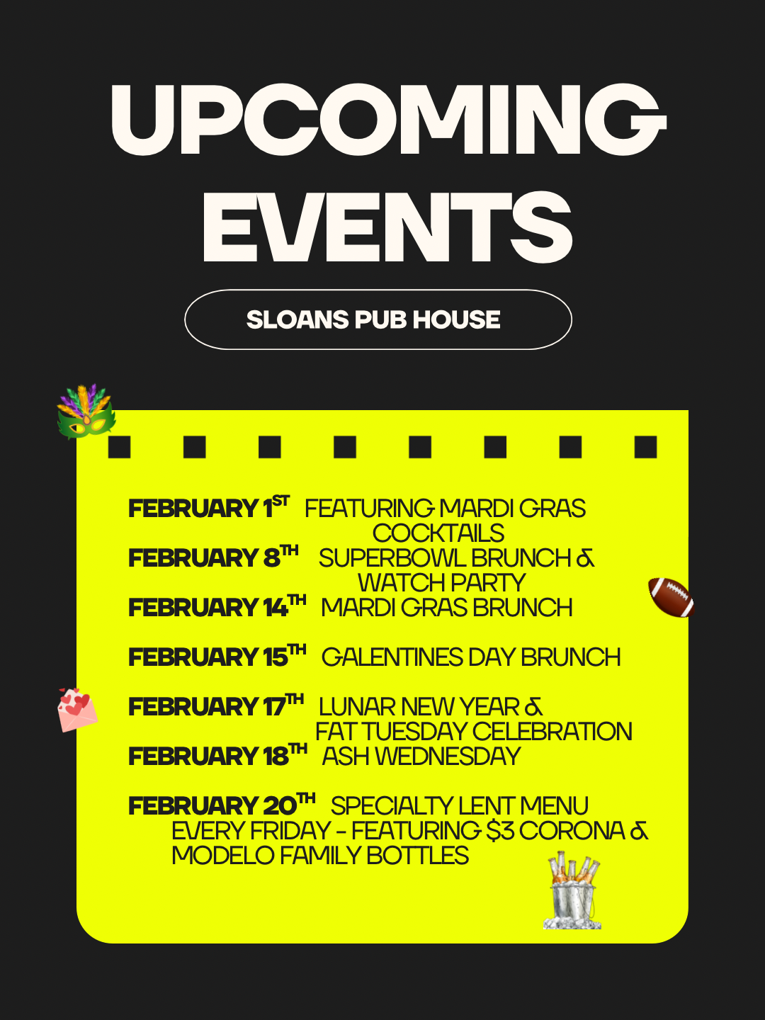 Mardi Gras Brunch is Saturday February 14th, from 10 am to 2 pm with bottomless mimosas. Full Menu till 10pm. Late Night Menu Till Midnight. DJ Starts at 10pm!!
